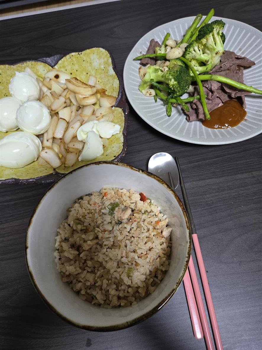화요일부터 저녁에 랭킹닭컴에서 산 닭가슴살 볶음밥 + 우둔살 + 기타 야채들 먹고 있습니다.