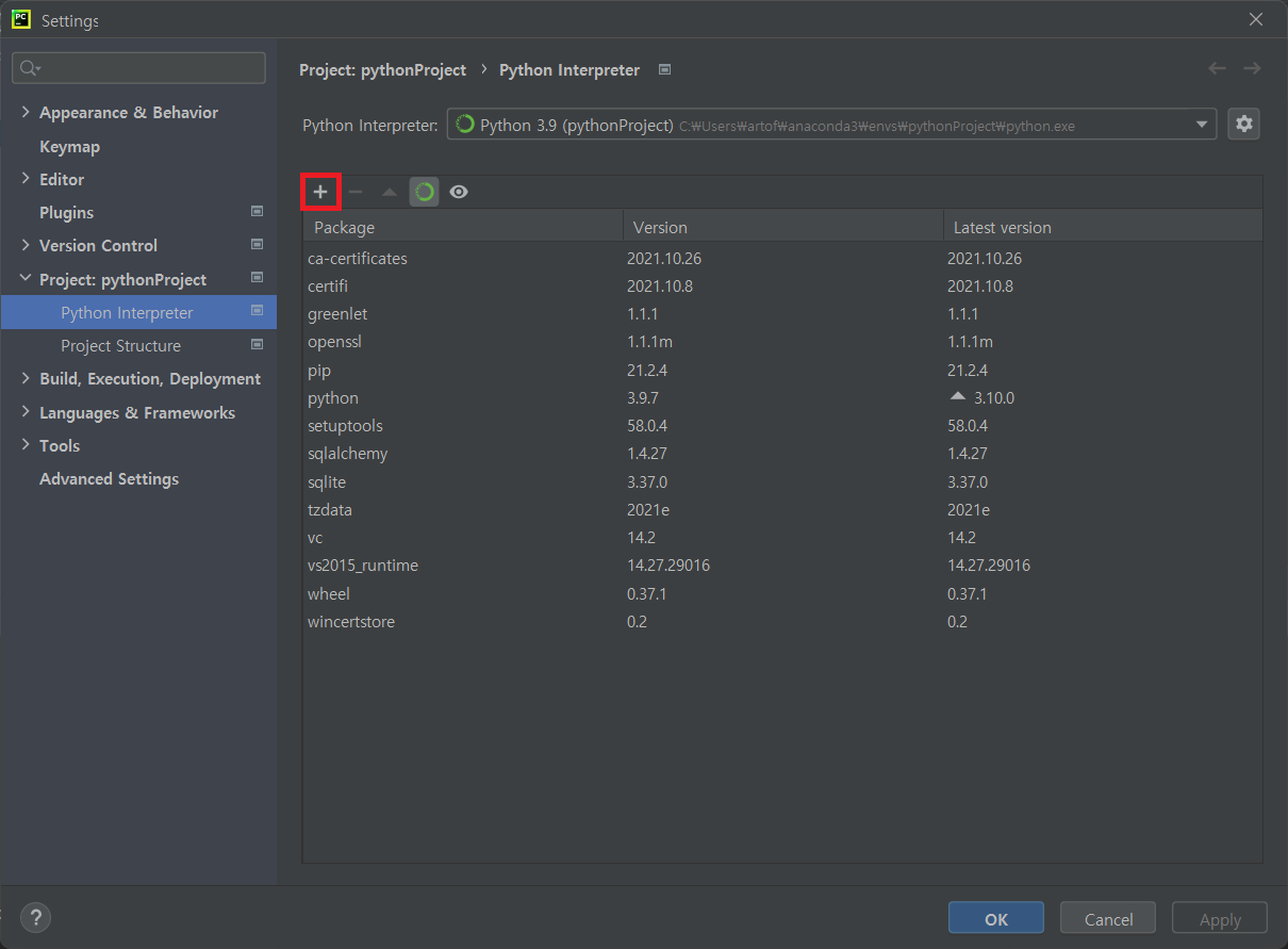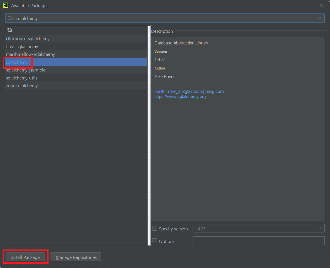 sqlalchemy 선택후 Install Package 설치 하면 끝