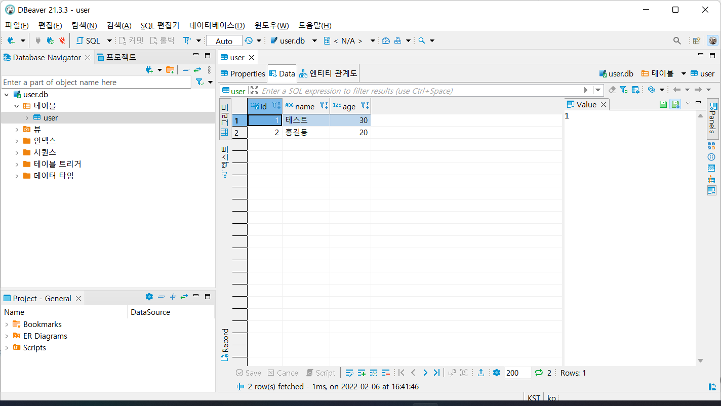 코드 실행후 조회 결과