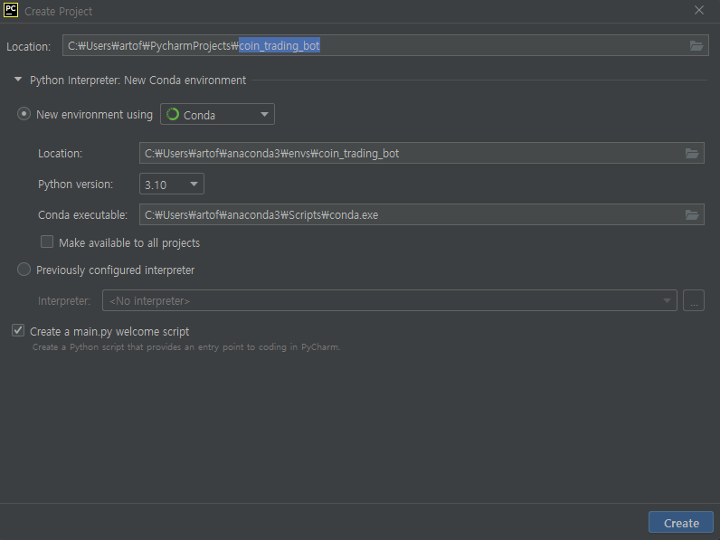 pip activate 프로젝트명 (ex: conda activate coin_trading_bot)
